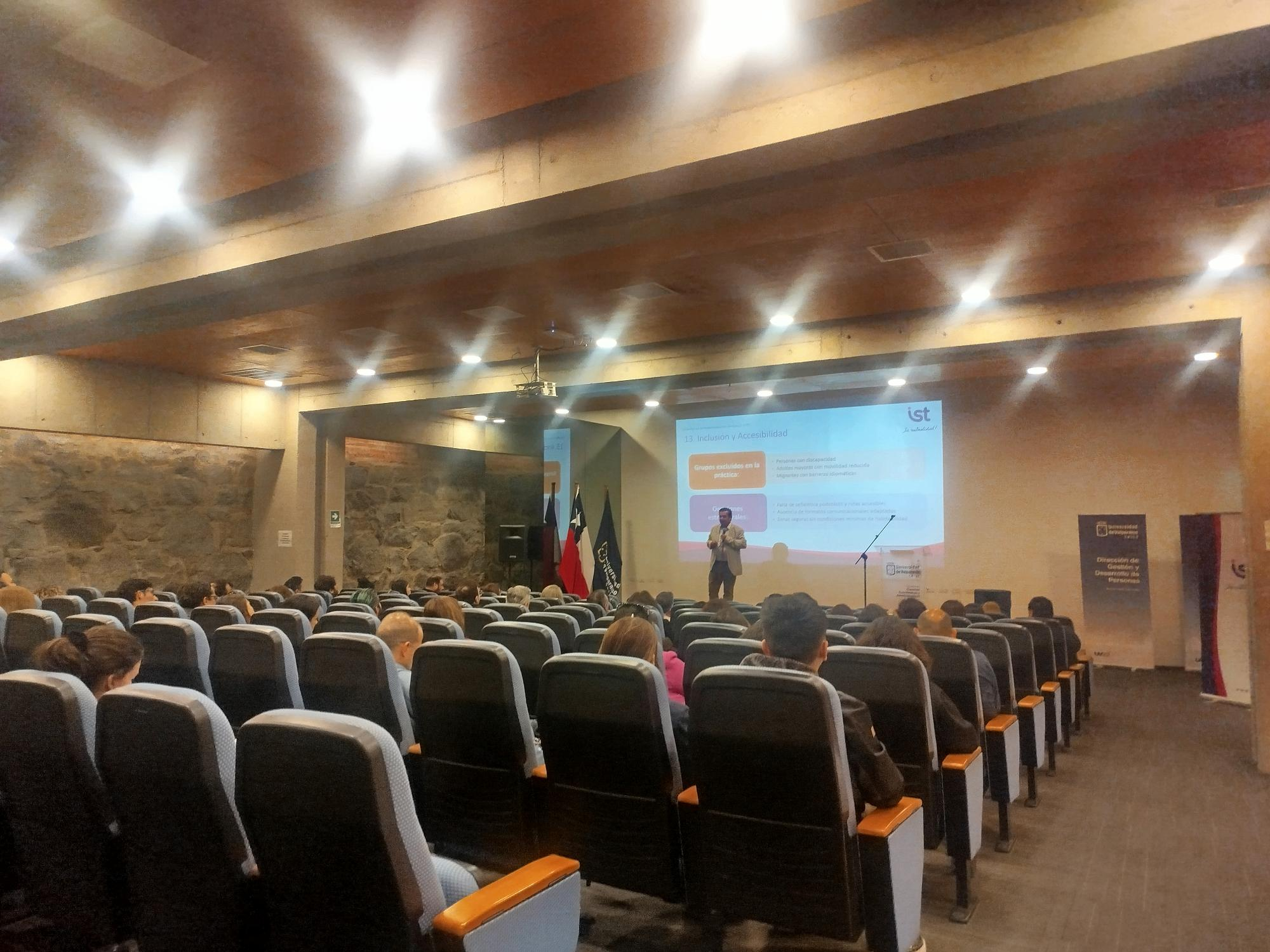 Posteriormente, el Programa UV Inclusiva de la DAE, junto a la Unidad de Seguridad y Salud Laboral de la Dirección de Gestión y Desarrollo de Personas (DGDP), presentaron el Protocolo de Gestión Inclusiva de Emergencias, documento que incorpora conceptos fundamentales sobre accesibilidad, rutas inclusivas, refugios y estrategias de acompañamiento, así como orientaciones para la comunicación, la evacuación y el apoyo durante situaciones de emergencia.