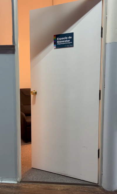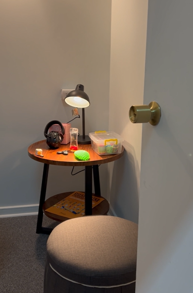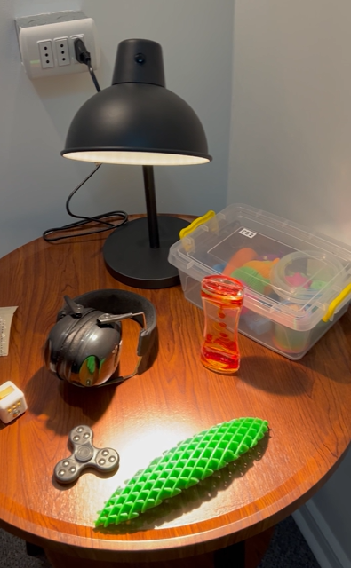 La sala de bienestar cuenta con diversos implementos orientados a la regulación sensorial, entre ellos audífonos con cancelación de ruido, sistemas de regulación de luz y otros dispositivos diseñados para favorecer un entorno accesible y adaptado a distintas necesidades.